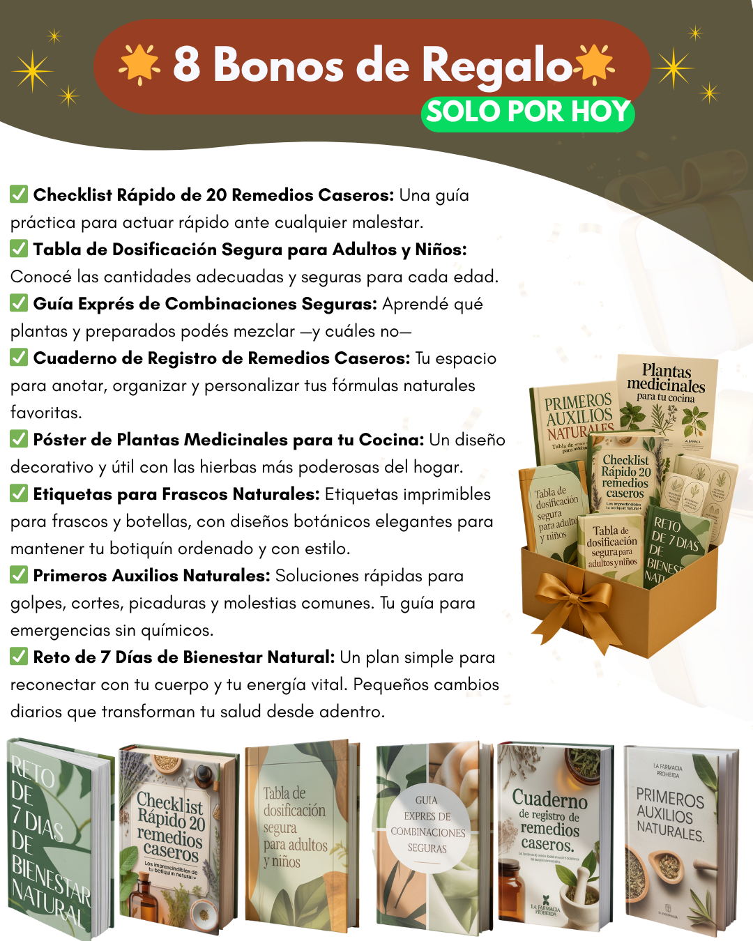 La diferencia es simple: La Farmacia Prohibida reúne 150 recetas verificadas, organizadas por dolencia, con dosis exactas y advertencias claras. En internet encontrás información dispersa, contradictoria y muchas veces peligrosa. Este libro te da todo en un solo lugar, fácil de buscar cuando lo necesitás, sin perder horas investigando. Es como tener una abuela sabia que te dice exactamente qué hacer para cada problema.
